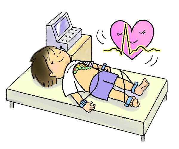 心電図検査(心臓検診)を受けている子のイラスト。