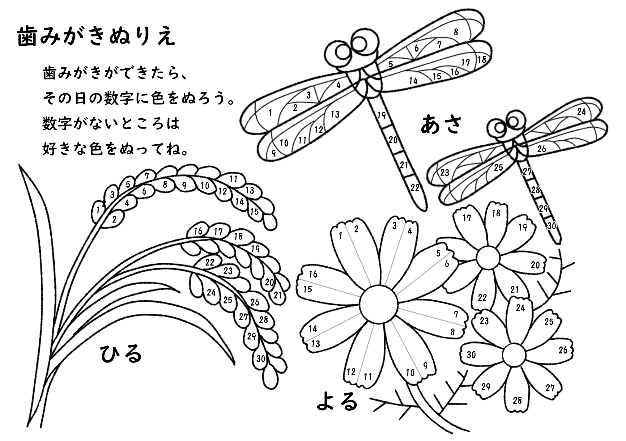 秋(9月)の歯みがきぬり絵です。数字あり(1~30)となしの2種類あります。各イラストのぬり絵ver.もありますので、歯みがきの他、お子さんのスモールステップの記録用や息抜きのぬり絵等、さまざまな用途でご利用いただけます。