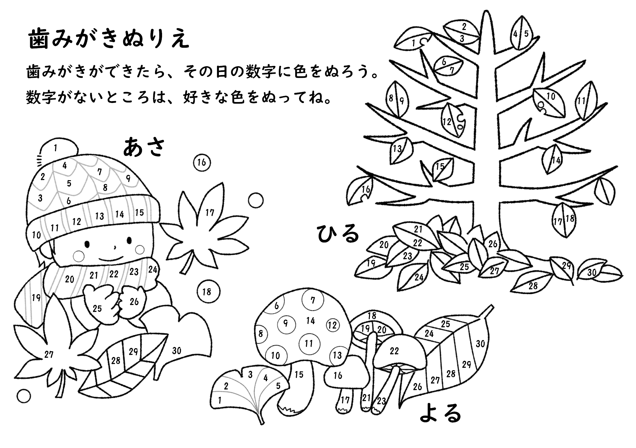秋(11月)の歯みがきぬり絵です。数字あり(1~30)となしの2種類あります。各イラストのぬり絵ver.もありますので、歯みがきの他、お子さんのスモールステップの記録用や息抜きのぬり絵等、さまざまな用途でご利用いただけます。