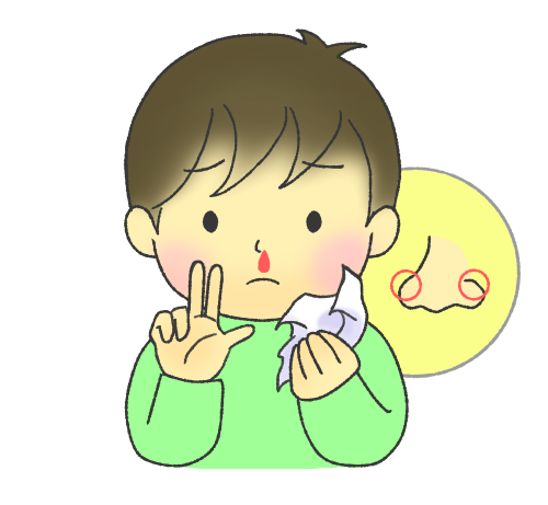 鼻血の止め方のイラストです。指で鼻の下のふくらみ(キーゼルバッハ部位)をつまむように押さえて止血します。(2025.2リニューアルしています)