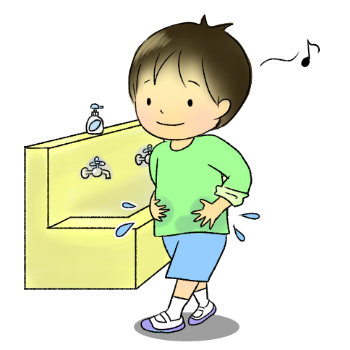 手洗い後、ハンカチを使わずに洋服で拭く子のイラスト。