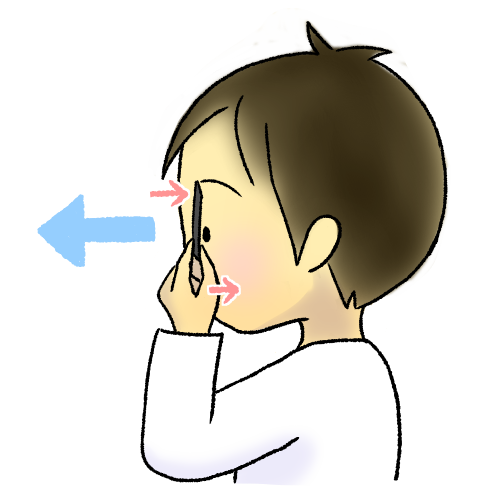 紙の遮眼子 使い方(横)横から見た、紙の遮眼子の使い方のイラスト。紙を持った手をほおに当てて、紙の上の部分が眉毛に当たるようにする。紙の遮眼子シリーズ その他は以下より★紙の遮眼子 使い方(前)紙の遮眼子 持ち方似ているイラスト フェイススケール① フェイススケール② フェイススケール③2021年4月2日投稿先 健康診断, 視力検査事前指導 視力 ← 過去の投稿へ 次の投稿へ →