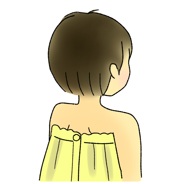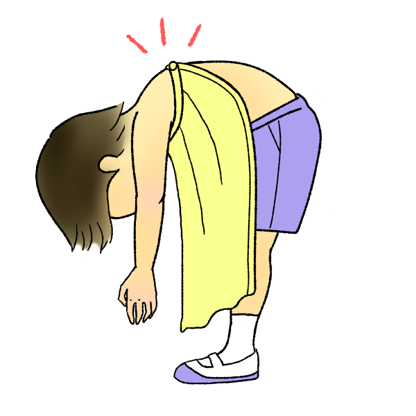 ラップタオルを着用して内科検診を受ける場合。脊柱側弯検診のためお辞儀をしているイラストです。ボタン側を背中に回し、一番上だけボタンを留めています。※リクエストイラスト