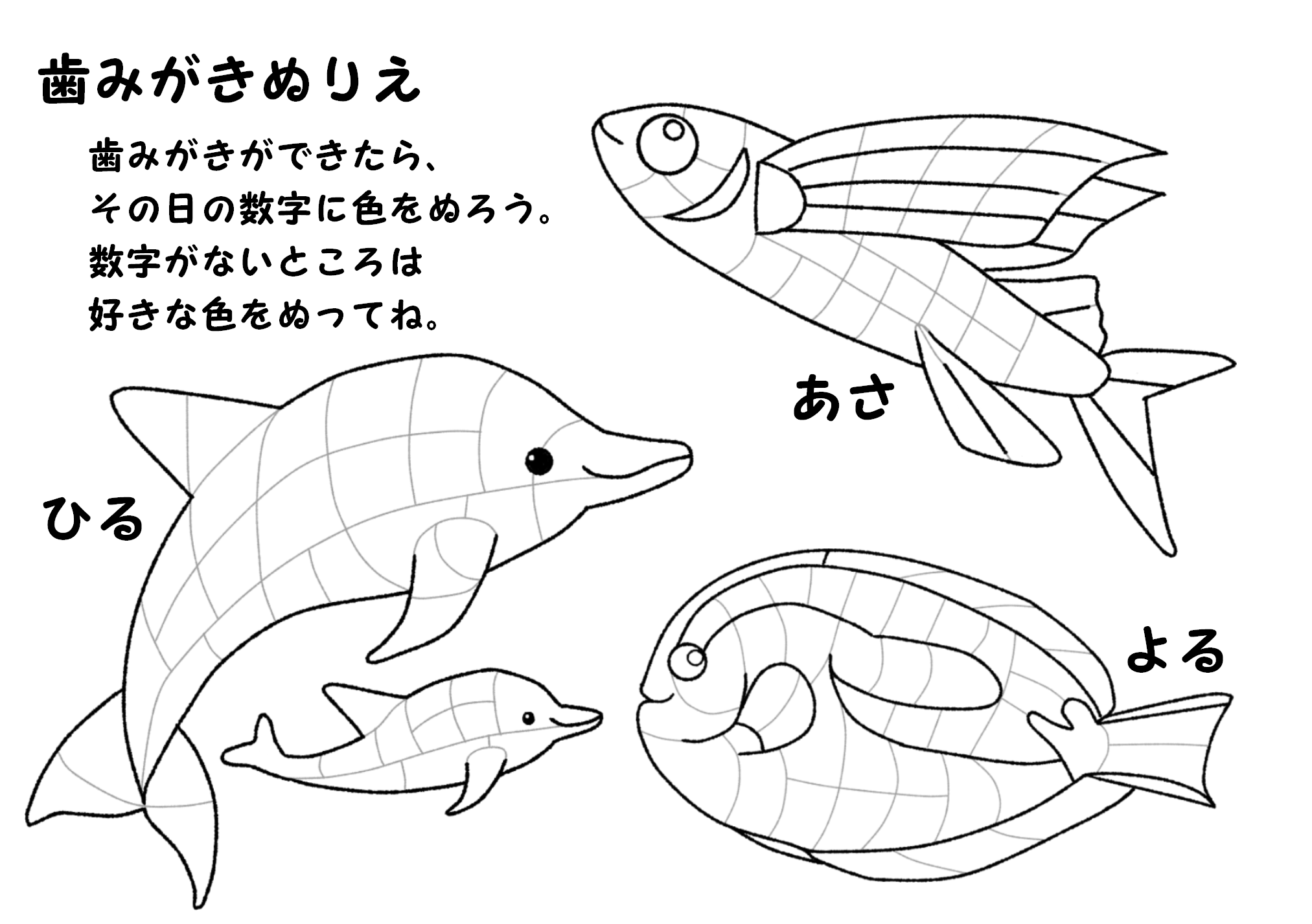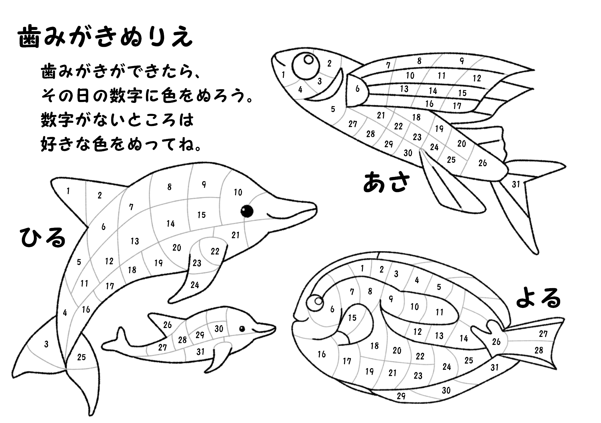 夏の歯みがきぬり絵です。数字あり(1~31)となしの2種類あります。各イラストのぬり絵ver.もありますので、歯みがきの他、お子さんのスモールステップの記録用や息抜きのぬり絵等、さまざまな用途でご利用いただけます。