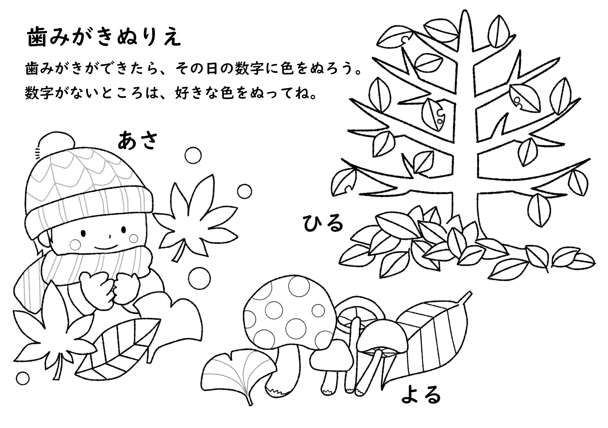 秋(11月)の歯みがきぬり絵です。数字あり(1~30)となしの2種類あります。各イラストのぬり絵ver.もありますので、歯みがきの他、お子さんのスモールステップの記録用や息抜きのぬり絵等、さまざまな用途でご利用いただけます。