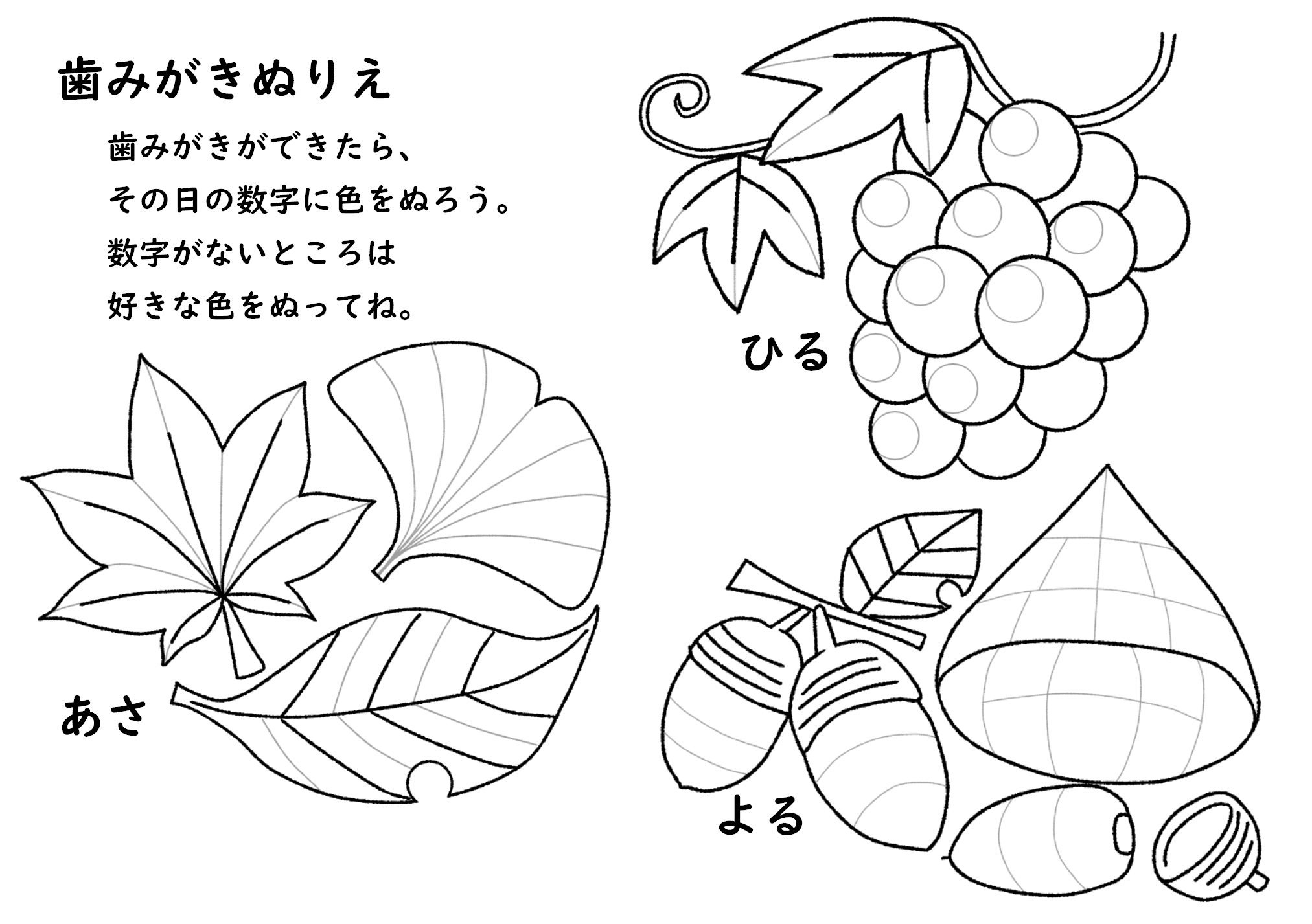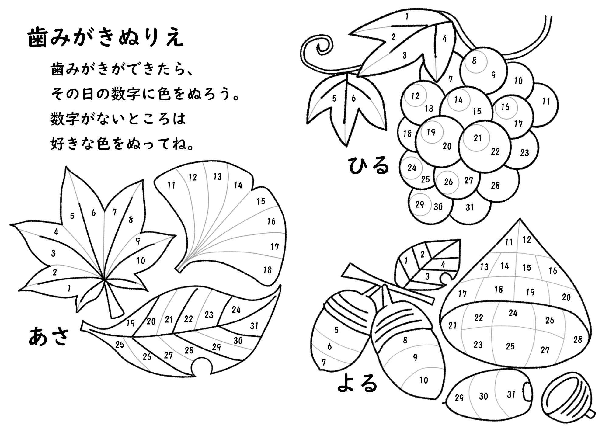 秋(10月)の歯みがきぬり絵です。数字あり(1~31)となしの2種類あります。各イラストのぬり絵ver.もありますので、歯みがきの他、お子さんのスモールステップの記録用や息抜きのぬり絵等、さまざまな用途でご利用いただけます。