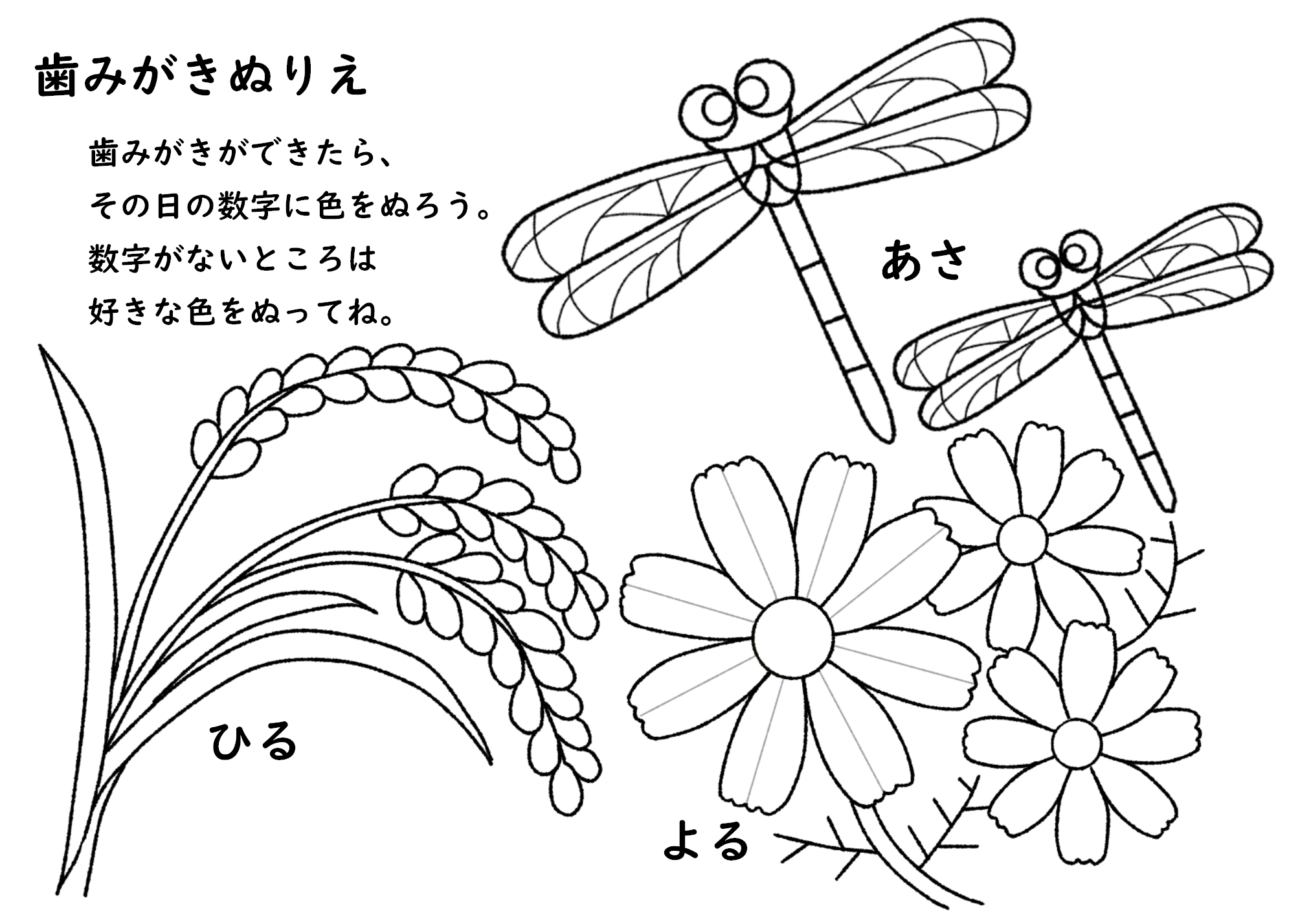 秋(9月)の歯みがきぬり絵です。数字あり(1~30)となしの2種類あります。各イラストのぬり絵ver.もありますので、歯みがきの他、お子さんのスモールステップの記録用や息抜きのぬり絵等、さまざまな用途でご利用いただけます。