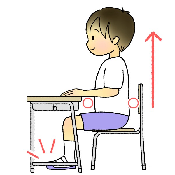 よい姿勢のイラストです。(背筋を伸ばし、足の裏を床にぴったり、お腹と背中に「グー」くらいの間隔をあけています)※ポイントマーク付きver.