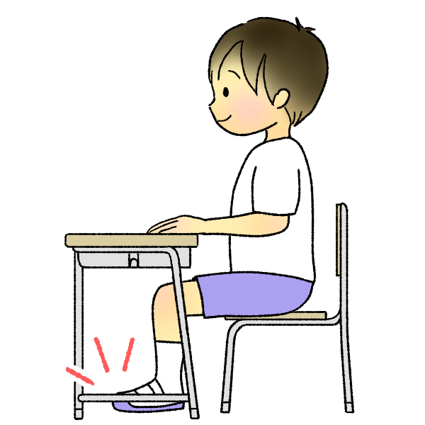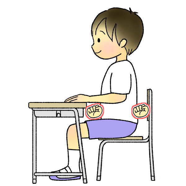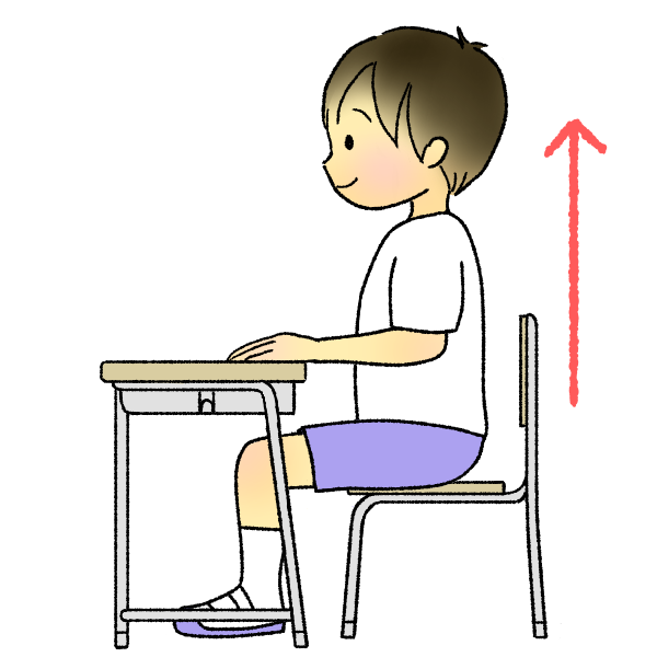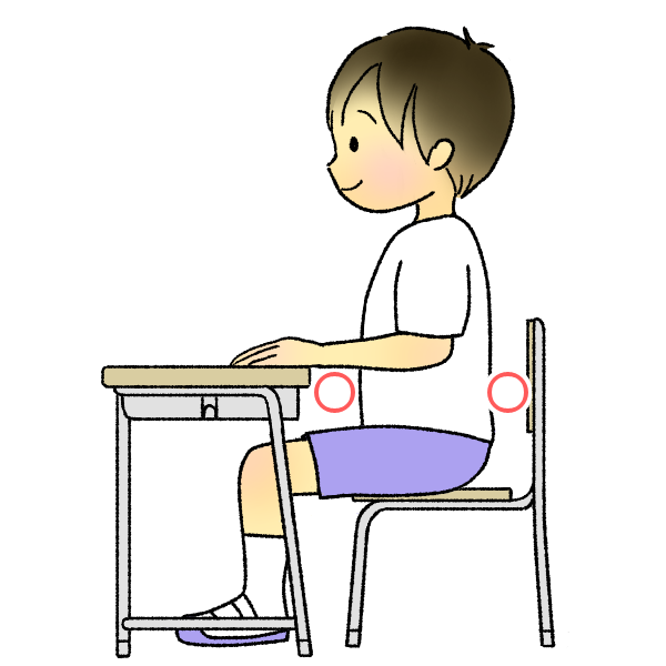 よい姿勢のイラストです。(背筋を伸ばし、足の裏を床にぴったり、お腹と背中に「グー」くらいの間隔をあけています)※ポイントマーク付きver.