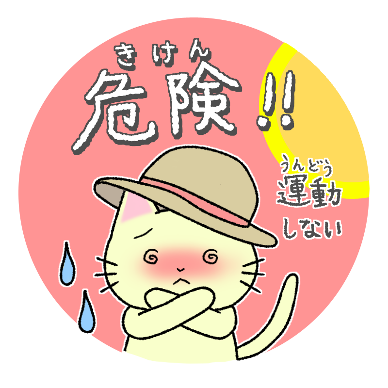 暑さ指数「危険」熱中症を予防する指標として環境省が用いている予報値「暑さ指数」をイメージしたイラストです。(※2022.8.5更新しました)↓ねこのみ↓他の「暑さ指数」のイラスト暑さ指数「ほぼ安全」暑さ指数「注意」暑さ指数「警戒」暑さ指数「厳重警戒」似ているイラスト 暑さ指数「ほぼ安全」 暑さ指数「注意」 暑さ指数「警戒」2021年6月2日投稿先 夏, 季節のイラスト, 熱中症, 病気のイラスト暑さ指数 熱中症予防 ← 過去の投稿へ 次の投稿へ →