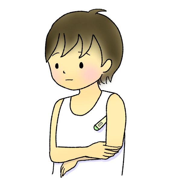 体温計(腋窩式体温計)の挟み方のイラスト。挟んでいる方と逆の手で、腕を押さえてじっとしています。
