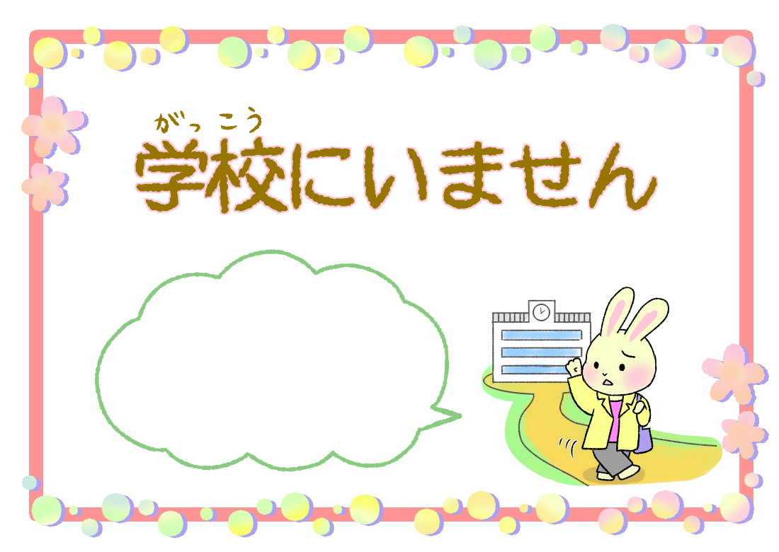 保健室前表示「学校にいません」吹き出しには、お好きなメッセージを入れてください。※職員室の先生に手当てをしてもらってください、など。ふりがな付はこちら似ているイラスト 保健室前表示「校庭(運動場)にいます」 保健室前表示「検診(健康診断)中です」 保健室前表示「校内をまわっています」2020年11月17日投稿先 うさぎ養護教諭, 保健室, 養護教諭の居場所うさぎ かわいい フレーム 保健室前表示 表示 飾り枠 養護教諭 ← 過去の投稿へ 次の投稿へ →