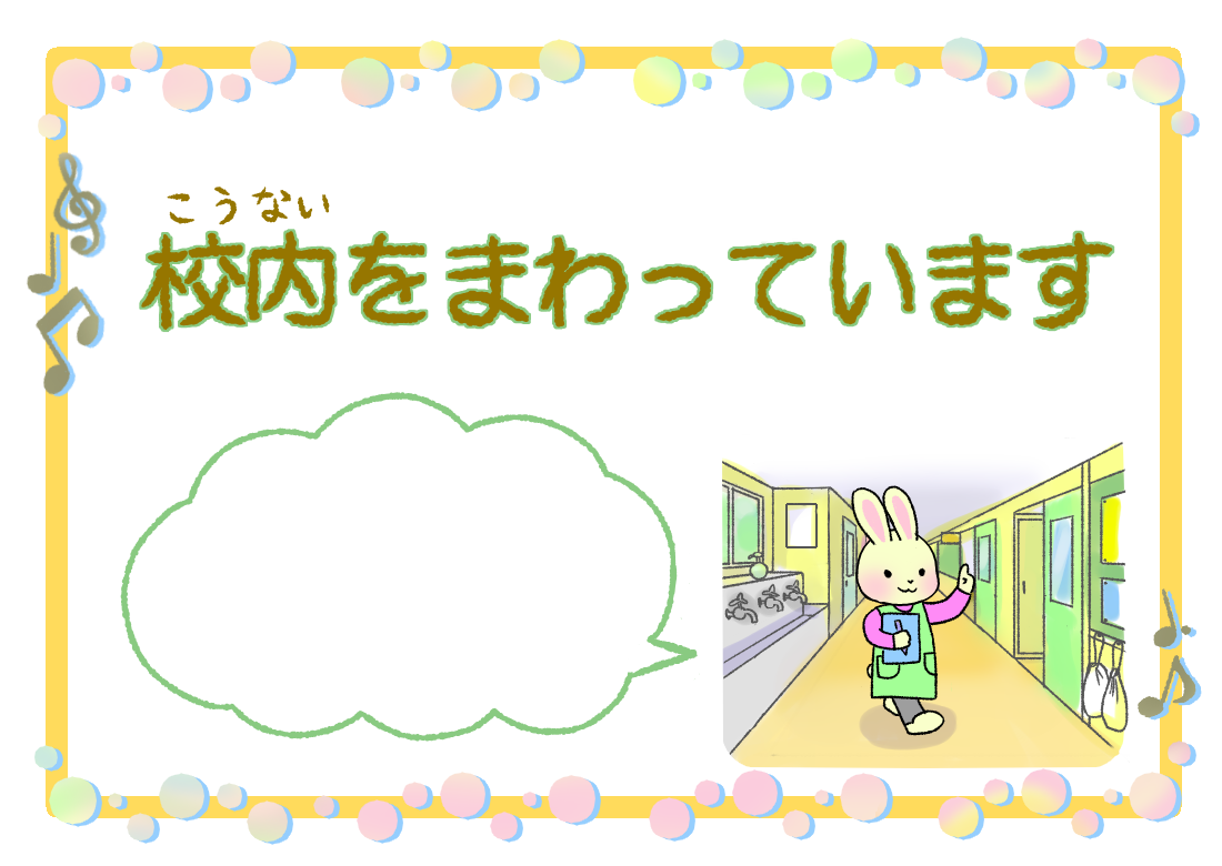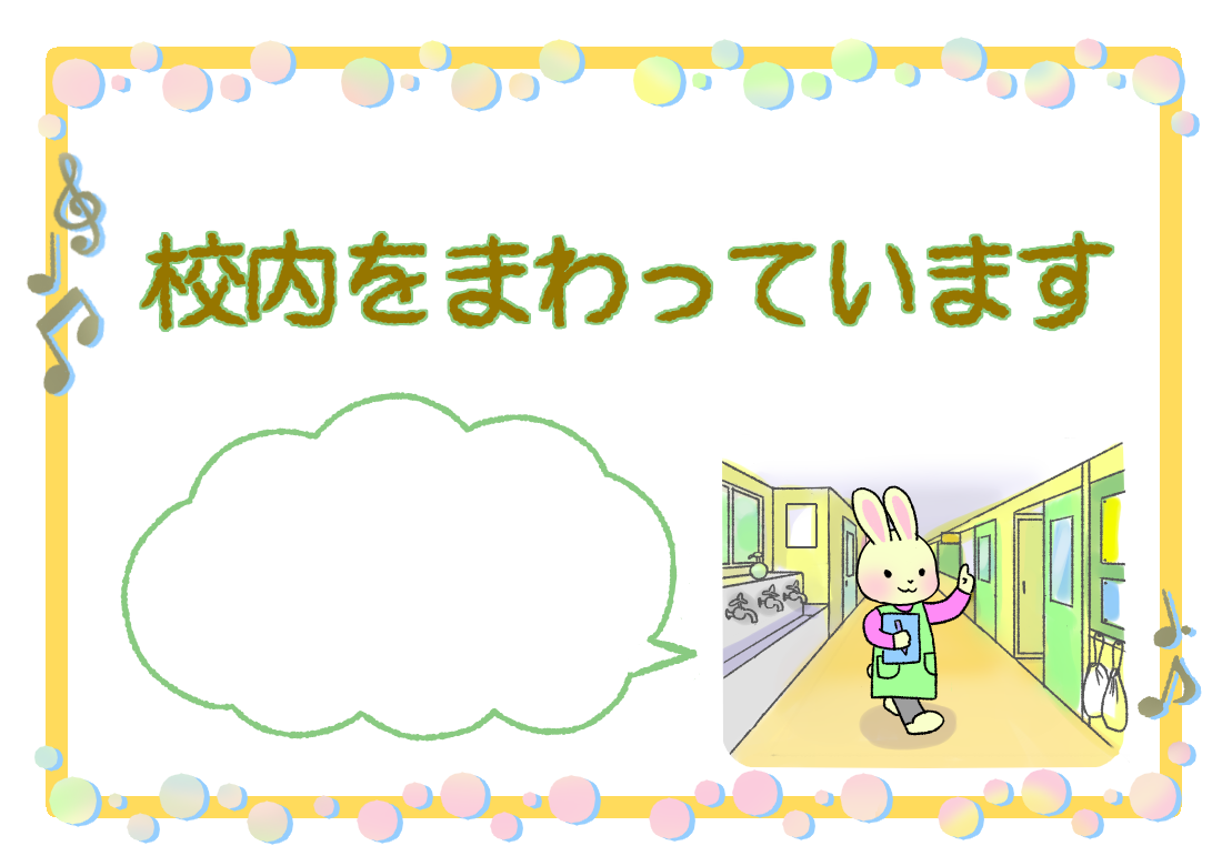 保健室前表示「校内をまわっています」吹き出しには、お好きなメッセージを入れてください。※急ぎの用事がある人は職員室へ知らせてください、など。ふりがな付はこちら似ているイラスト 保健室前表示「校庭(運動場)にいます」 保健室前表示「検診(健康診断)中です」 保健室前表示「学校にいません」2020年11月17日投稿先 うさぎ養護教諭, 保健室, 養護教諭の居場所うさぎ かわいい フレーム 保健室前表示 表示 飾り枠 養護教諭 ← 過去の投稿へ 次の投稿へ →
