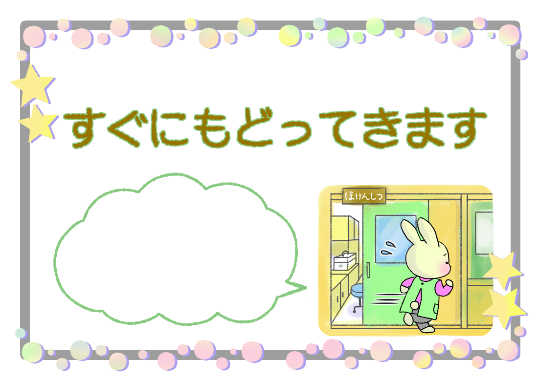 保健室前表示「すぐ戻ってきます」吹き出しには、お好きなメッセージを入れてください。※ここで待っていてね、保健室の中で待っていてね、など。似ているイラスト 保健室前表示「保健室にいます」 保健室前表示「職員室にいます」 保健室前表示「学校にいません」2020年11月17日投稿先 うさぎ養護教諭, 保健室, 養護教諭の居場所うさぎ かわいい フレーム 保健室前表示 表示 飾り枠 養護教諭 ← 過去の投稿へ 次の投稿へ →