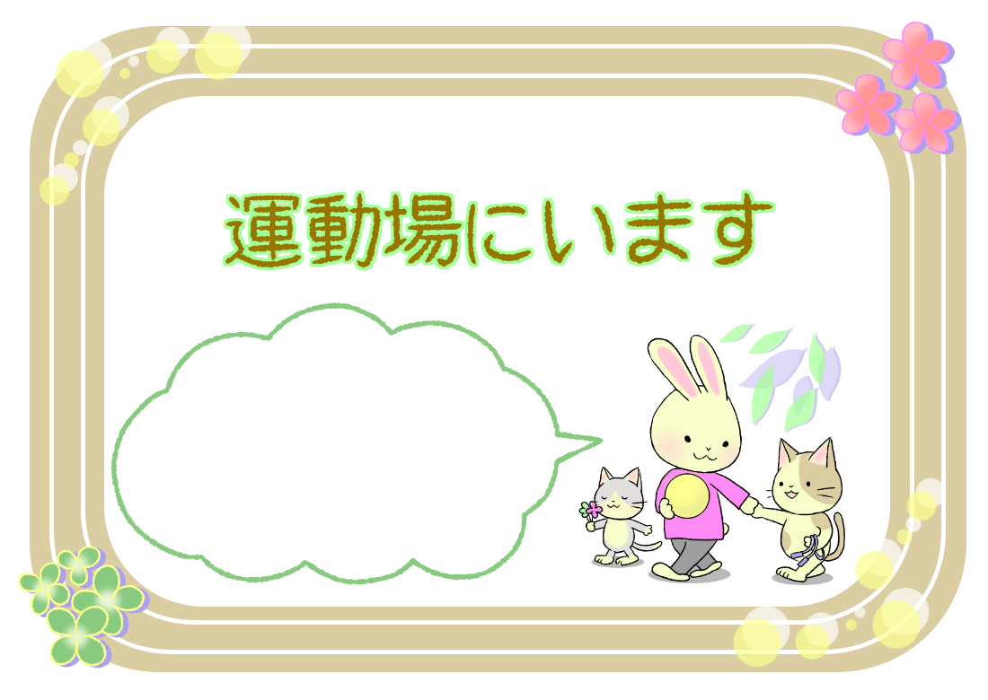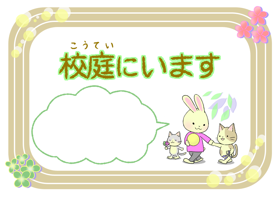 保健室前表示「校庭(運動場)にいます」吹き出しには、お好きなメッセージを入れてください。※職員室の先生に手当てをしてもらってください、など。『校庭』にいますふりがな付はこちら『運動場』にいますふりがな付はこちら似ているイラスト 保健室前表示「検診(健康診断)中です」 保健室前表示「保健室にいます」 保健室前表示「体育館にいます」2021年4月25日投稿先 うさぎ養護教諭, 保健室, 養護教諭の居場所うさぎ かわいい フレーム 保健室前表示 表示 飾り枠 養護教諭 ← 過去の投稿へ 次の投稿へ →